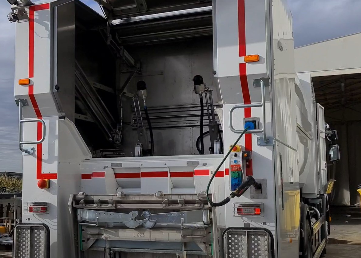 Tunnuþvottabíllinn notar kraftmikla háþrýstispýssa til að þrífa ílátin með 70° heitu vatni.